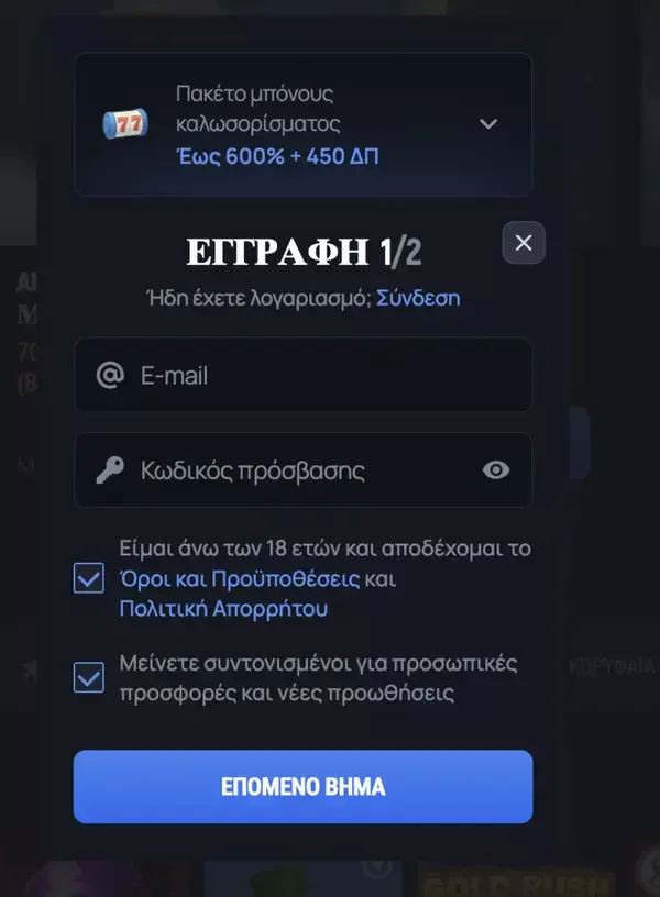 Ανοίξτε το βασικό μενού και επιλέξτε το κουμπί εγγραφής για να ξεκινήσετε. Αν εμφανιστεί επιλογή προσφοράς καλωσορίσματος, διαλέξτε την προσφορά που θέλετε πριν υποβάλετε τη φόρμα. Αν ο ιστότοπός μας εμφανίζει πολλαπλές περιοχές προϊόντων, επιλέξτε αυτή που θέλετε να χρησιμοποιήσετε πρώτα (για παράδειγμα, καζίνο) και στη συνέχεια συνεχίστε· συνήθως μπορείτε να αλλάξετε μέσα από το λόμπι αργότερα.